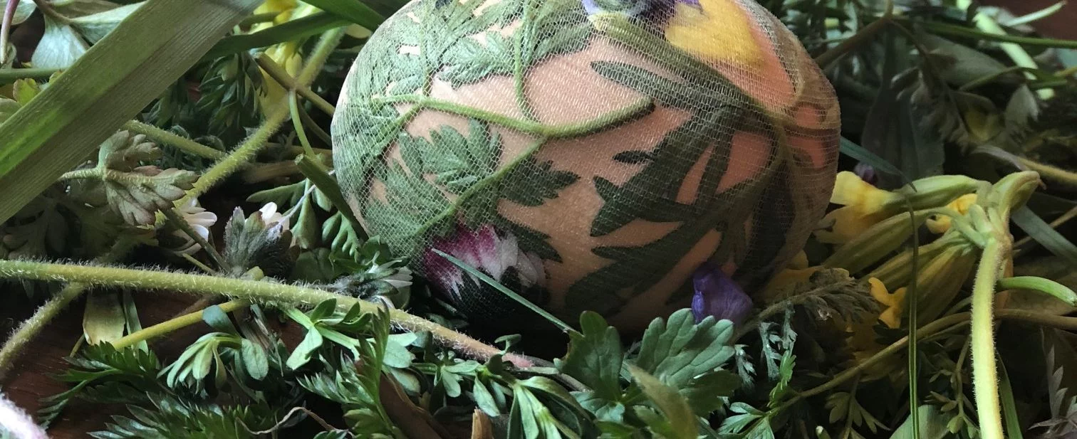 Ein Stück Seidenstrumpf wird auf den Tisch gelegt. Darauf verteilt man nach Belieben Blüten, Zwiebelschalen oder Kräuter. Dann kommt ein weißes Ei auf den Strumpf. Das rohe Ei sollte vorsichtig mit den Kräutern und dem Seidenstrumpf ummantelt werden. Ob Sie viel oder wenig Kräuter verwenden, ein Muster legen möchten oder einfach sehen wollen, was raus kommt, der Phantasie und Kreativität sind keine Grenzen gesetzt! Wichtig ist nur, dass die Deko mit dem Seidenstrumpf schön straff um das Ei gebunden ist, damit die Umrisse der Kräuter, Blüten und Zwiebelschalen auf der Eioberfläche schön zur Geltung kommen. Dann kocht man die Eier im farbigen Wasser. Wie man Naturfarben selber herstellt, beschreiben wir im nächsten Absatz. Es können aber auch gerne handelsübliche Farben verwendet werden. Gießen Sie einen Schuss Essig ins Wasser, das ergibt einen schönen Glanz und macht die Farbe kräftiger. Je nach Belieben wählt man seine Kochzeit 7 – 8 Minuten für wachsweiche Eier, bis zu 10 Minuten für harte Eier. Da natürlich auch jeder Herd anders ist, kann man sich gerne auf seine gewohnte Zeit beim Eierkochen verlassen. Nach dem Kochen schneidet man die Päckchen vorsichtig auf und staunt, welche Muster sich ergeben haben. Geben Sie noch ein wenig Öl oder Fett auf ein weiches Tuch und reiben Sie damit die gefärbten Eier ein, damit sie schön glänzen.
